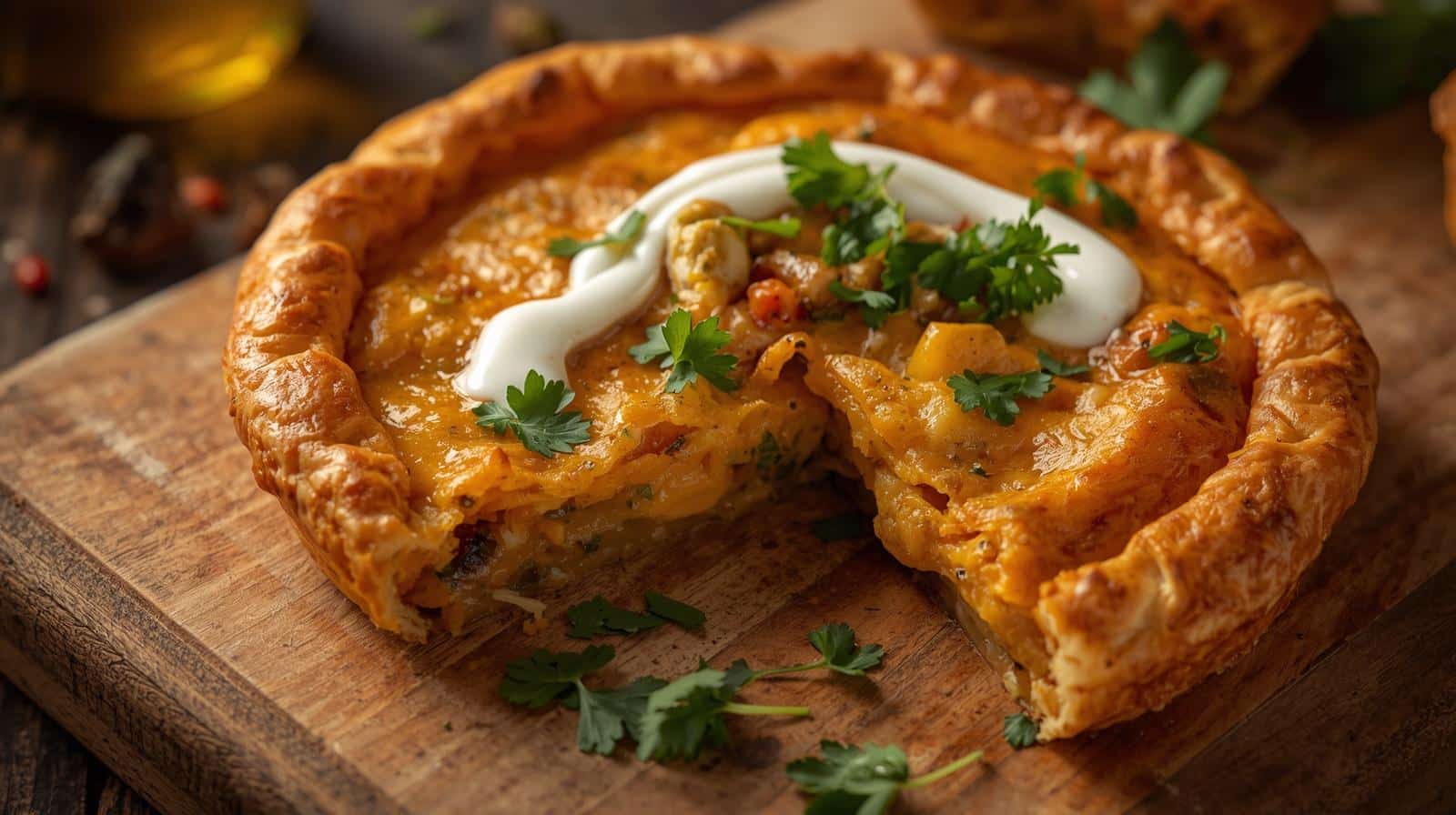 Deze vegetarische hartige taart wordt gemaakt met courgette, erwten en aardappel en er zit groene curry doorheen. Paneer is een harde kaas die vaak gebakken wordt.